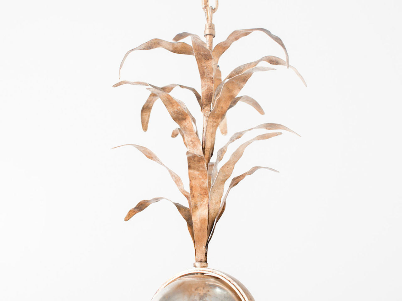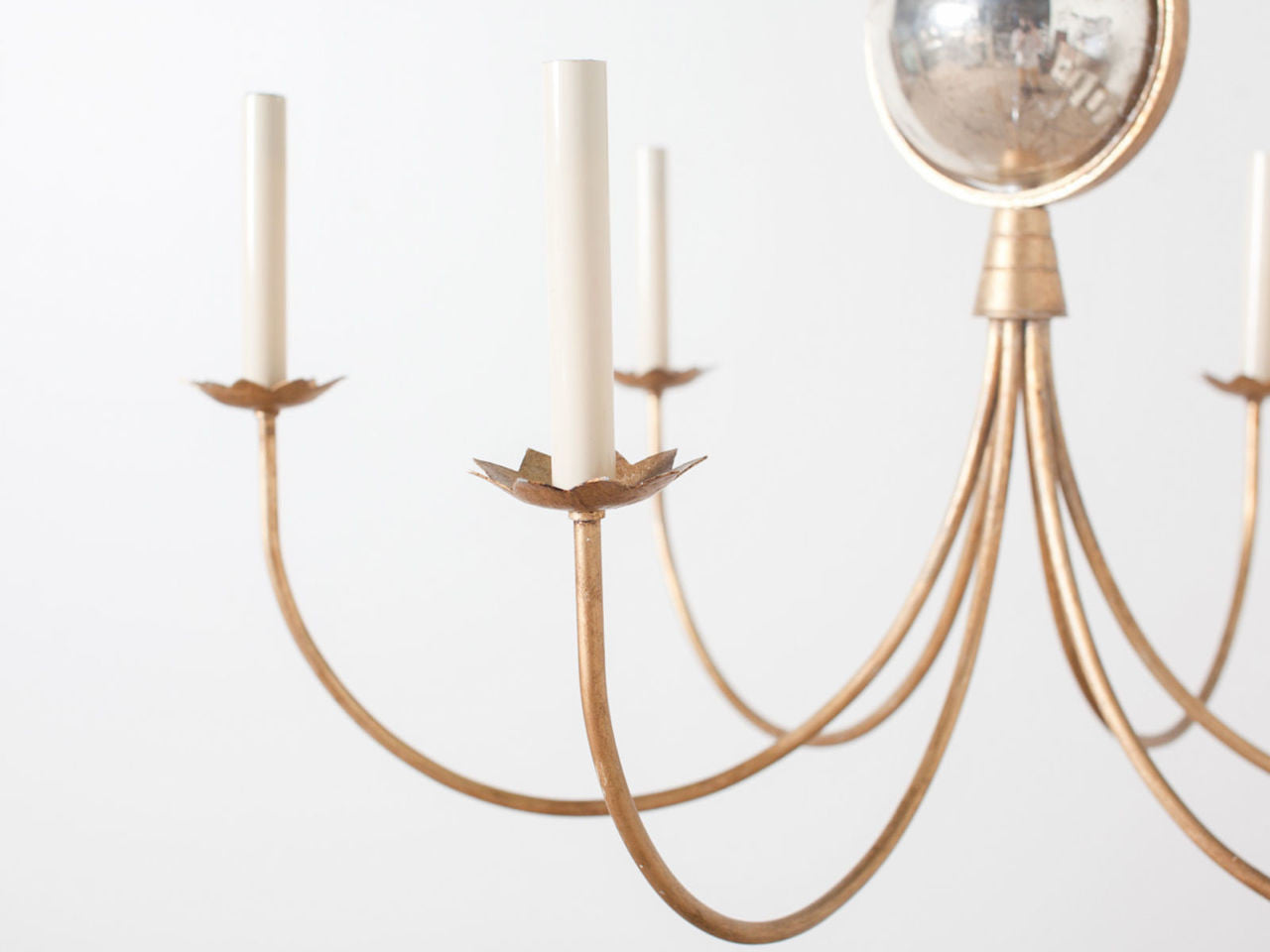 Delicate and distinctive, the Gramercy Chandelier highlights a unique mix of materials to lend an iconic elegance to formal spaces. Featuring hand-sculpted wheat leaf detailing and a gleaming, hand-applied, antiqued mirror sphere, the Gramercy design boasts slender curved arms that hold candle-inspired lights.