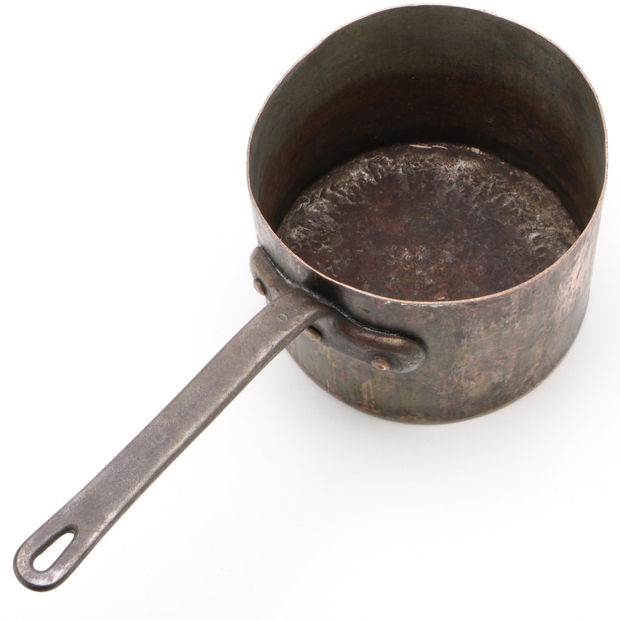 Antique Copper Saucepan made by John Van Range Co. of Cincinnati. Cast iron handle. Overall patina and surface wear consistent with age and use. Measures 10.25" W x 7.5" H x 22" D