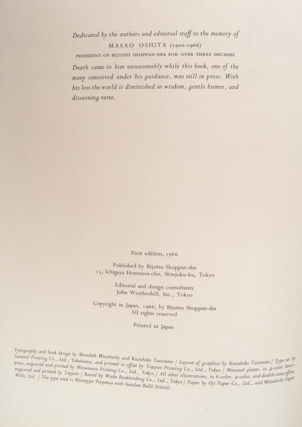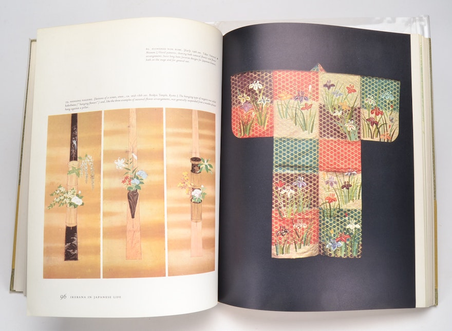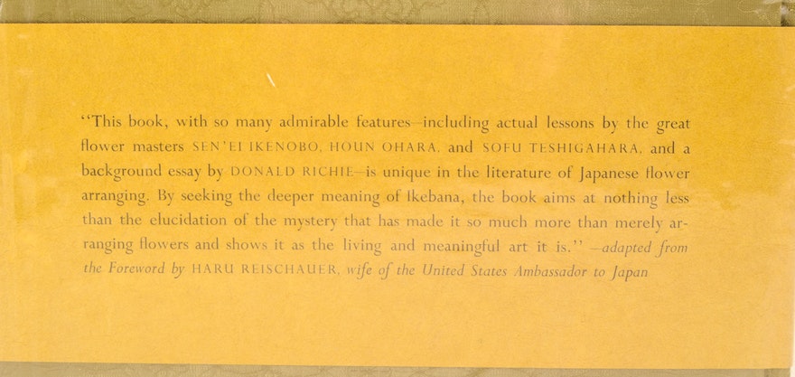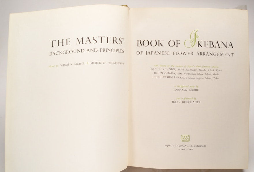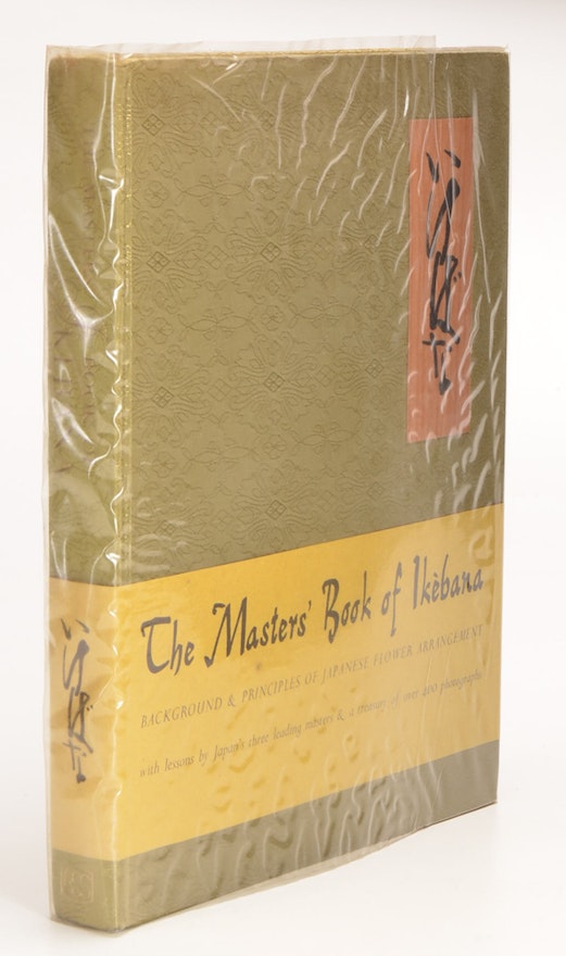 A 1966 first edition The Master’s Book of Ikebana edited by Donald Richie and Meredith Weatherby. This coffee table book about Japanese flower arrangement was published by Bijutsu Shuppan-Sha from Tokyo, Japan and is decoratively board bound in jacquard fabric.