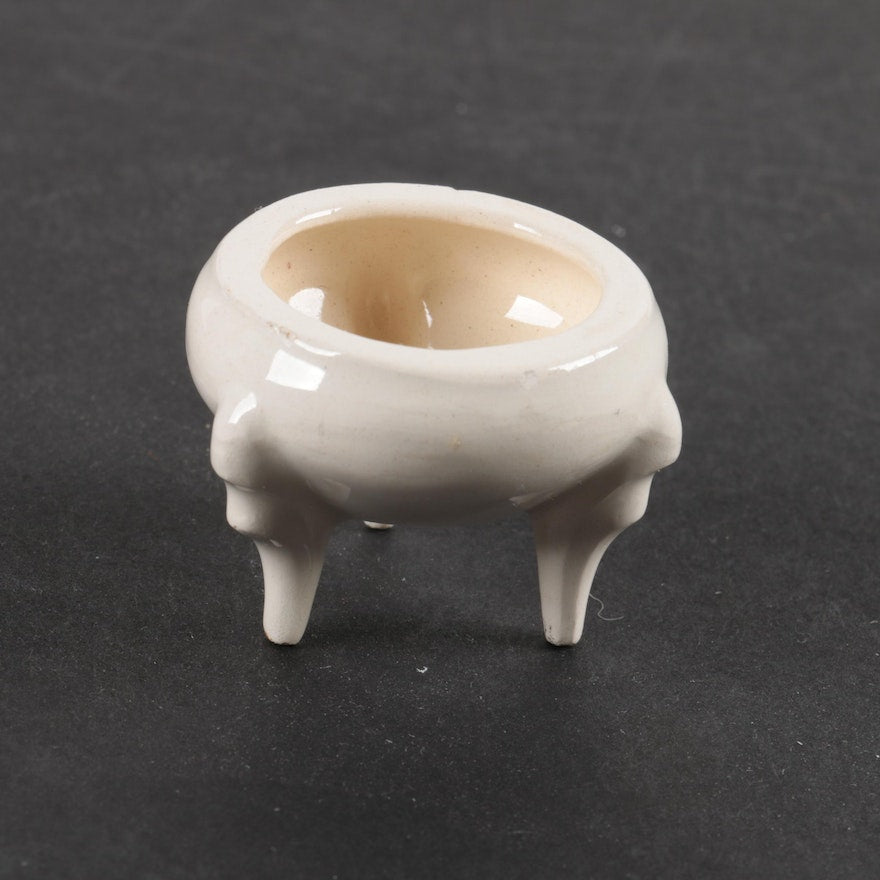 A milk glass trinket box. This round diminutive white box rises on three bracket feet and has round lid top. Unmarked.